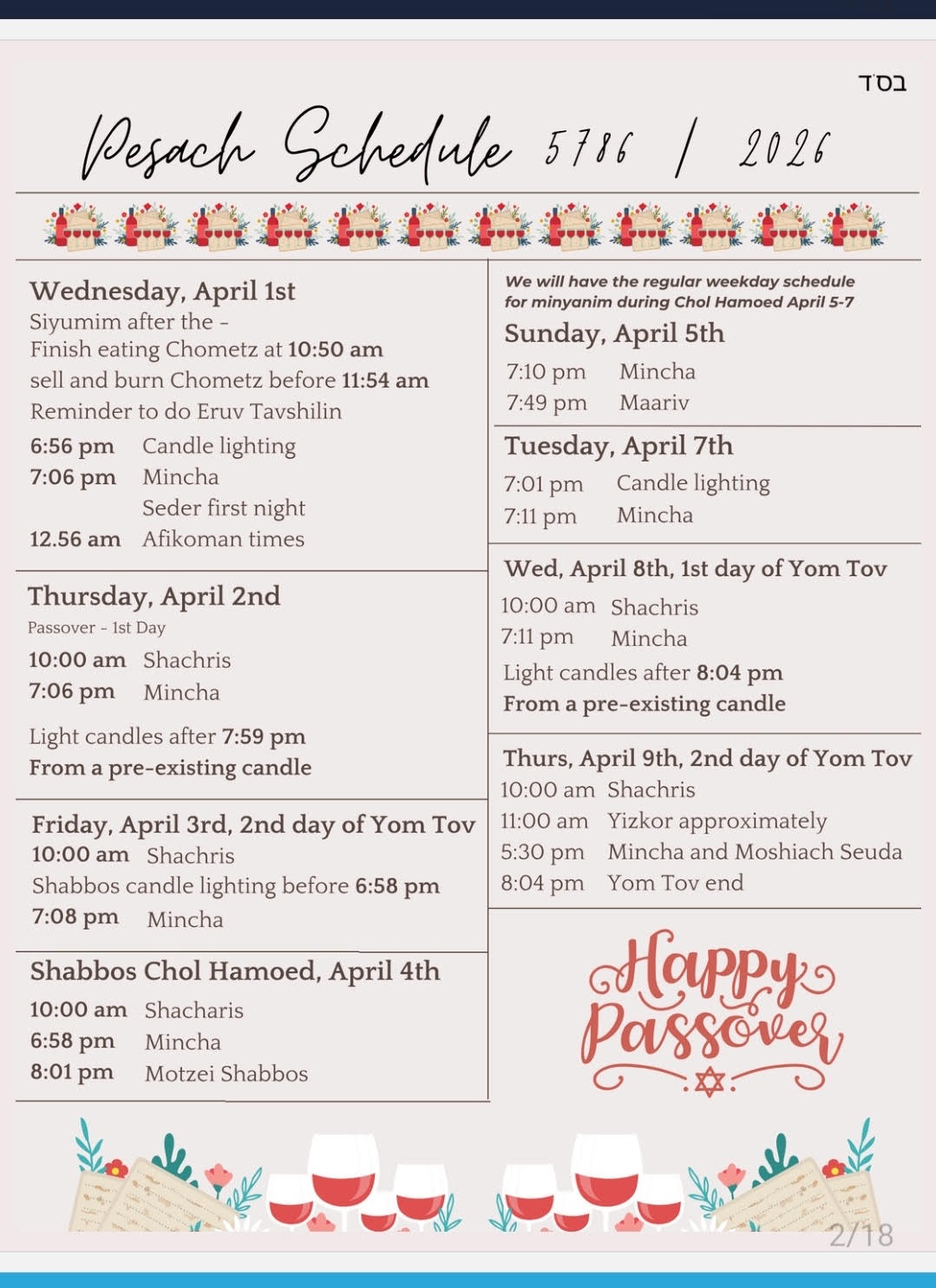 Join us for a warm, inspiring, and traditional Passover Seder with community, song, insights, and a delicious holiday meal. Wednesday, April 1 & Thursday, April 2 Services: 7:00 PM Followed by the Seder Led by Rabbi Daniyel & Ahava GlaskieReservation Due by March 21 Saturday NightCelebrate freedom together at our community's family Seder!Join us for a warm, inspiring, and traditional Passover Seder with community, song, insights, and a delicious holiday meal. Wednesday, April 1 & Thursday, April 2 Services: 7:00 PM Followed by the Seder Led by Rabbi Daniyel & Ahava GlaskieReservation Due by March 28 Saturday NightCelebrate freedom together at a meaningful community Seder!